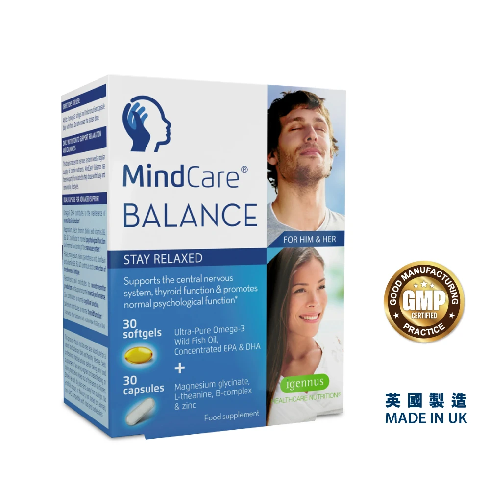 助您鬆弛神經 減輕焦慮驚恐 紓解壓力緊張 改善睡眠質素 有助甲狀腺功能正常 提升腎上腺分泌激素有助解困 促進生產神經傳遞物質(多巴胺、GABA和褪黑激素) rTG再酯化型式製造魚油丸 →達至科技上最高吸收率 野生細魚濃度85%奧米加3魚油 →優質安全促成更佳療效 奧米加3 EPA →促進生產神經傳遞物質 奧米加3 DHA →維持大腦功能正常 甘氨酸鎂 →增進細胞氧氣和能量 L-茶氨酸 →天然活性成分鎮靜平和身心 鋅 →加強腦部認知功能 硒 →有助甲狀腺功能正常(過度的情緒壓力會影響甲狀腺功能) 維生素B族、維生素C和鎂 →維護神經系統運作正常 維生素B族、維生素C、葉酸和鎂 →保持心理健康 維生素B族、鎂和葉酸 →有助減輕疲倦 維生素B5 →有助維生素D合成神經傳遞物質保持心理健康 每盒提供1個月份量 每日1次各1粒 1粒含660毫克頂級奧米加3魚油丸 1粒針對性優質營養素(維生素+礦物質+氨基酸) 適合青少年至成人服用 最佳於餐後或飽肚服用 本產品由英國廠方送往IFOS檢測符合IFOS標準並取得認證。