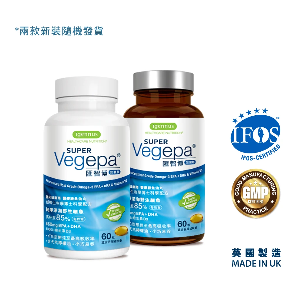 高含量EPA及DHA的Super Vegepa內含維生素D3營養,天然檸檬油減低魚腥味,奧米加3濃度85%,適合6歲至成人服用。 整粒膠囊不但可以吞服或咬嚼,亦可混於食物和飲品之中食用。 Super Vegepa以rTG技術製造,比較市面上一般魚油和磷蝦油,營養會更易被身體細胞吸收。rTG再酯化型式成本高昂,故此全球罕有魚油丸產品採用rTG型式製造。 Super Vegepa奧米加3含量是Vegepa原味的2.3倍;Vegepa原味加多半粒價錢,就有雙倍以上的奧米加3營養,優質划算。 本產品由英國廠方送往IFOS檢測符合IFOS標準並取得認證。
