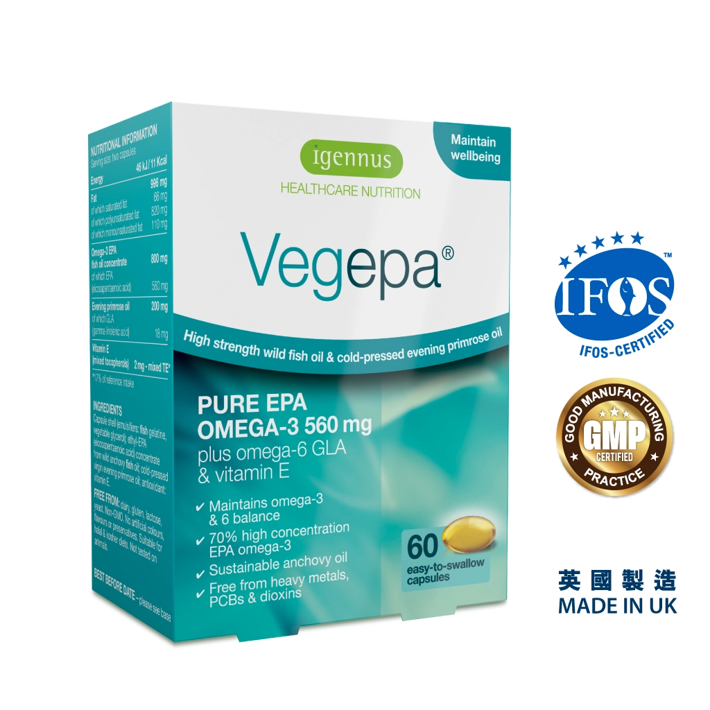 Vegepa原味內含純EPA,並添加GLA營養,適合2歲開始服用。 整粒膠囊不但可以吞服或咬嚼,亦可混於食物和飲品之中食用。 Vegepa原味有魚腥味,但基於是野生細魚關係,所以較其他牌子的魚油鮮甜,大部分小朋友都不會抗拒,亦有喜歡到要偷食。 Vegepa採用有機冷壓初榨月見草油蘊含的GLA營養,是屬於奧米加6脂肪酸。 如果身體GLA不足,便無法正常合成攝護腺素,會使身體各部分產生各種障礙,而且容易衍生氣管問題和皮膚過敏性的症狀。 Vegepa不但比市面上的魚油丸優質純淨,而且採用的GLA成分,含有非常有助免疫力、抗氧化及抗炎的三萜Triterpenes(靈芝亦含三萜營養),是天然溫和的頂級營養補充品。 本產品由英國廠方送往IFOS檢測符合IFOS標準並取得認證。